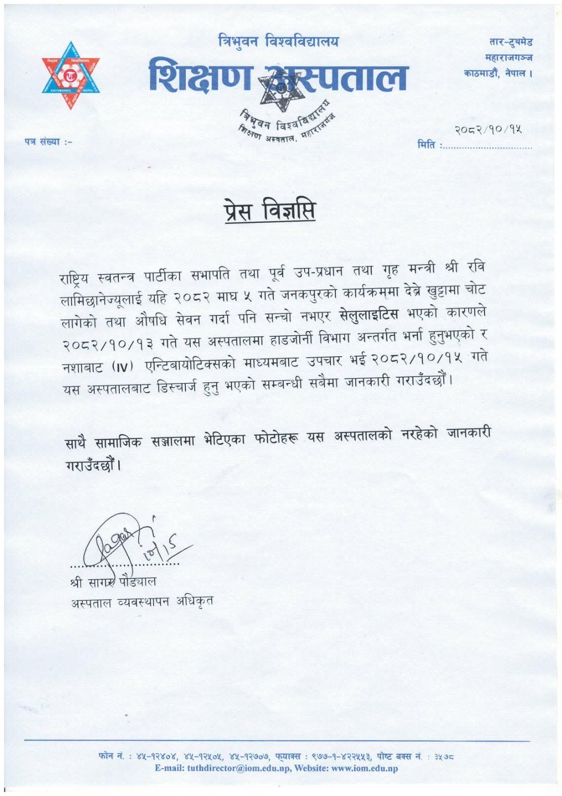 प्रेस विज्ञप्तिमा अस्पताल व्यवस्थापन अधिकृत सागर पौड्यालले उक्त जानकारी सार्वजनिक गरेका हुन्।
