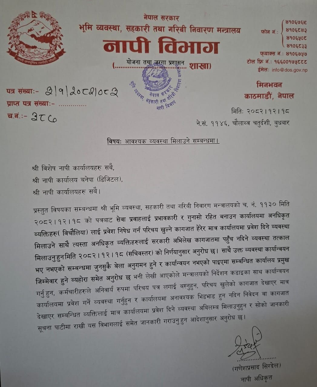 मन्त्रालयका अनुसार मन्त्री प्रतिभा रावलको निर्देशनमा सचिवस्तरीय निर्णय गर्दै सबै सम्बन्धित कार्यालयलाई परिचय खुल्ने कागजातका आधारमा मात्र सेवाग्राहीलाई प्रवेश गराउन पत्राचार गरिएको हो।